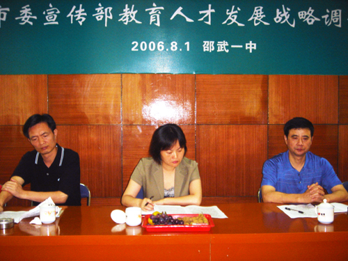 校园新闻 市委宣传部到我校开展教育人才发展战略研讨会 作者:admin 来源:本站原创 日期:2006-08-03 人气:5079 市委宣传部到我校开展教育人才发展战略研讨会 上一篇:福建大境堂旅游公司资助我校贫困大学生 下一篇:八一前夕我校领导到73886部队慰问官兵 通知公告 更多 【瑞榴 • 公告】2026年邵武一中第... 【瑞榴 • 公告】2026年邵武一中自... 【瑞榴 • 公告】2026年福建省邵武... 【瑞榴 • 公告】2026年福建省邵武... 【瑞榴 • 公告】2025年邵武一中第... 【瑞榴 • 公告】2025年福建省邵武... 最新动态 更多 【瑞榴 • 德育】春启新程育桃李 ... 【瑞榴 • 德育】百日淬烽尽,六月... 【瑞榴 • 校园开放日】百年传薪启... 【瑞榴 • 德育】凝心聚力启新程 ... 【瑞榴 • 家校活动】瑞榴沁家校 ... 【瑞榴 • 教研】喜报!邵武一中课... 【瑞榴 • 学生活动】薪火相传,筑... 【瑞榴 • 安全】严排查、除隐患、... 【瑞榴 • 初中活动】瑞榴润教 安... 【瑞榴 • 德育】瑞榴润心 育真同...