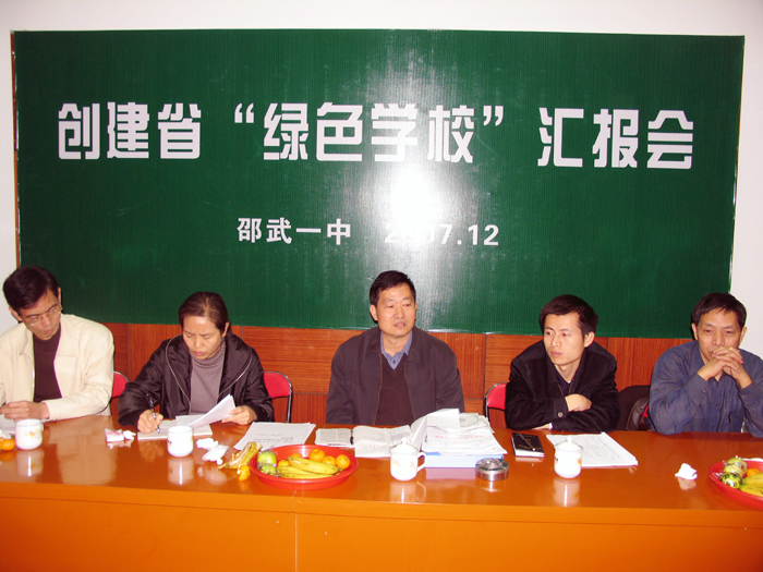 2007年12月11日下午,省环保局、教育厅创建“绿色学校”考评组领导、专家一行9人在省环保局宣教中心教育科科长黄妙云的带领下到我校考评创建工作。考评组听取了政教处主任杨方作的《创建绿色学校 建设和谐校园》的学校环境教育工作汇报,查阅了有关资料,到校园、食堂、实验室等实地查看,召开了教师和学生座谈会。