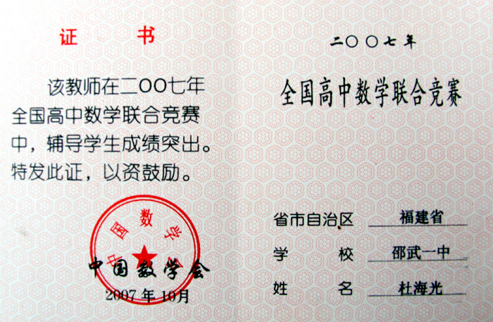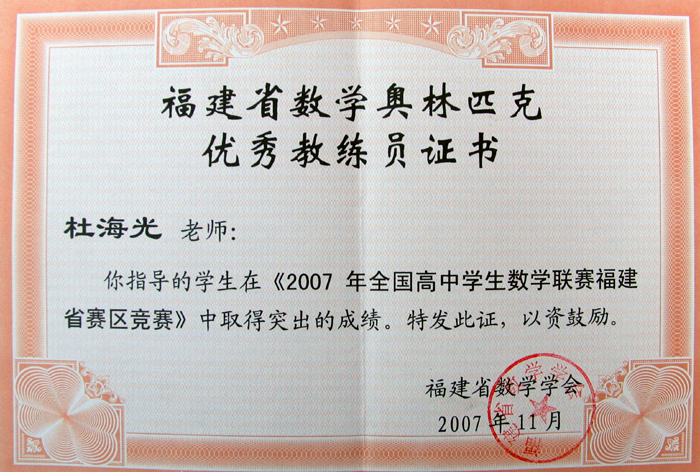 近日,2007年全国高中数学联赛传来佳音,我校高三(3)班的游健同学同学获全国一等奖,指导教师杜海光被中国数学会、福建省教育厅授予“全国高中数学联赛优秀教练员”称号。
