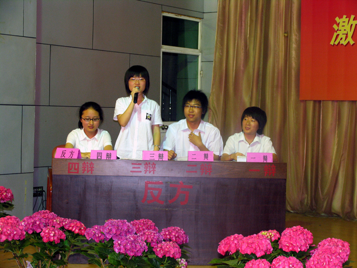 经初赛选拔出的高一和高二年段明星队8名选手组成了正反两方,围绕着“北京奥运应立足于民族化,还是应立足于国际化”的话题展开激烈辩论。整个辩论赛历时1个多小时,双方唇枪舌剑,慷慨陈词,场面紧张而激烈,赢得了评委和观众的阵阵掌声。经过评审团的严格审核,最终以“举办奥运应该立足于民族化”的正方即高二年段明星队获胜,比赛还评选出1名最佳辩手(高一的魏玮)、4名优秀辩手(高二年段明星队),校领导和来宾为获胜队颁发了证书和奖品。