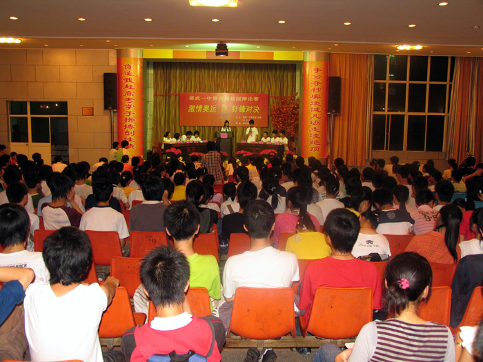 在2008年北京奥运会倒计时76天之际,5月24日晚,“激情奥运,针锋对决”邵武一中第六届校园辩论赛高一、高二明星对抗赛在校学生报告厅举行。邵武团市委范晓蓉副书记,市教育局德育科的叶青桦科长,邵武一中杨方副校长,政教处李秀林主任,政教处陈丹副主任,校团委吴昊书记到场观看了比赛。