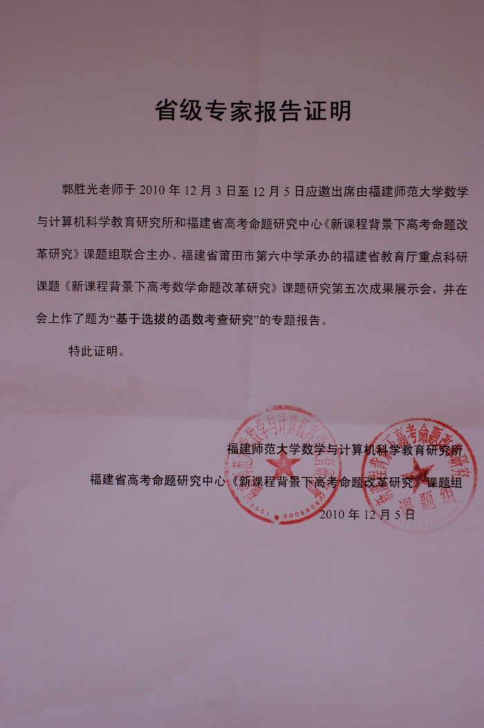日前,郭胜光、吴志坚两位老师代表邵武一中参加由福建省高考命题研究中心举办的福建省教育厅重点科研课题《新课程背景下高考数学命题改革研究》课题研究第五次成果展示会议,全省高校、教研、中学等部门的三百多位教授、专家、学者和教师参加了会议。会上郭胜光老师以“基于选拔的函数考查研究”为题在展示会上作了专家报告,与会代表一致认为郭老师的报告既有理论高度又有实践经验,更难能可贵的是他把人们印象中冰冷严谨的数学演变的既妙趣横生又不乏深入的思考。会上总课题组还认为一中数学课题组关于《高考数学主干知识考查研究》水平居全省一流。