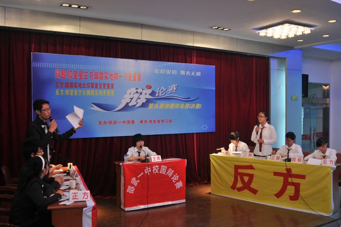 22日,邵武一中第九届校园辩论赛决赛现场座无虚席、气氛热烈,历时二个多月的以“纪念建党九十周年”为主题的第九届校园辩论赛圆满落幕。正反两方围绕“仰望星空和脚踏实地哪一个更重要”为辩题展开激烈的辩论,双方辩手针锋相对,唇枪舌剑,你来我往,以智慧和口才展示了他们的青春与活力。