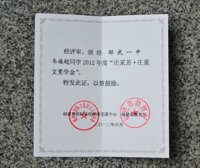 省教育厅、省国际文化经济交流中心6月14日公布荣获2012年“庄采芳·庄重文奖学金”学生名单,邵武一中2012届韦福超同学榜上有名,这是学校自“庄采芳·庄重文奖学金”创立以来第38人荣获此殊荣。