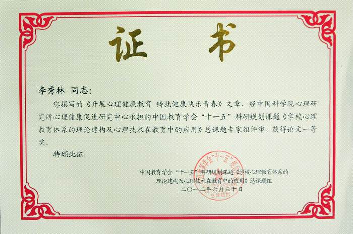 喜讯:一中三篇论文在中国教育学会心理健康教育“十一五”科研规划课题研究成果评选中荣获一等奖
