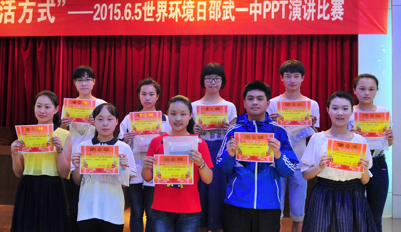 为增强学生的环保意识,邵武一中于6月4日在教工会议室举行了以“促进可持续发展”为主题的PPT演讲比赛。比赛中,选手们紧扣主题,慷慨陈词,或幽默风趣、或鞭辟入里,激动处声情并茂,赢得了阵阵掌声。虽然演讲风格各有不同,但选手们都以饱满的激情发出了同一个声音:关注生态环境、共建地球家园!