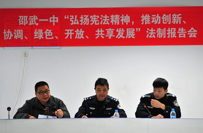 为迎接即将到来的国家宪法日暨全国法制宣传日,邵武一中于30日下午通过校园网络电视系统,以电视直播的方式向全校师生实时召开了一场主题为“弘扬宪法精神,推动创新、协调、绿色、开放、共享发展”的法制报告会。本次报告由一中纪委书记周国华主持,邀请了校综治副校长朱警官主讲。朱警官通过几个生动的实际案例,深入浅出地向同学们普及法律知识,并号召同学们学法、懂法、守法,做一个合格社会主义接班人。