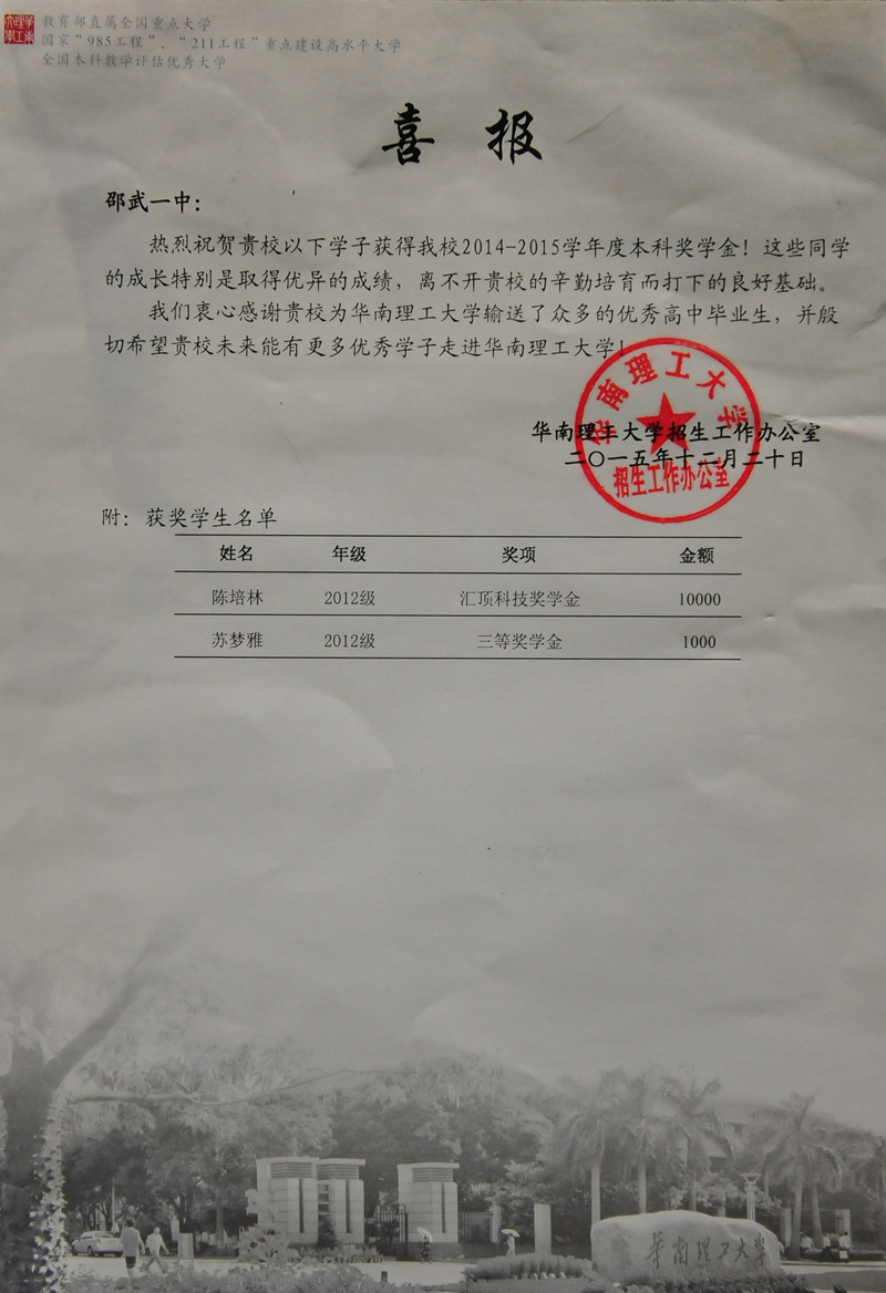 校园新闻 喜报:一中毕业生获华南理工大学汇顶科技奖学金 作者:admin 来源:本站原创 日期:2016-01-06 人气:4149 上一篇:一中毕业生钟彦涛进入墨尔本大学攻读硕士 下一篇:邵武市市委副书记、市长陈敏辉到邵武一中调研 通知公告 更多 【瑞榴 • 公告】2026年邵武一中第... 【瑞榴 • 公告】2026年邵武一中自... 【瑞榴 • 公告】2026年福建省邵武... 【瑞榴 • 公告】2026年福建省邵武... 【瑞榴 • 公告】2025年邵武一中第... 【瑞榴 • 公告】2025年福建省邵武... 最新动态 更多 【瑞榴 • 教研】深化课堂教学改革... 【瑞榴 • 安全】家校协同筑牢“舌... 【瑞榴 • 德育】春启新程育桃李 ... 【瑞榴 • 德育】百日淬烽尽,六月... 【瑞榴 • 校园开放日】百年传薪启... 【瑞榴 • 德育】凝心聚力启新程 ... 【瑞榴 • 家校活动】瑞榴沁家校 ... 【瑞榴 • 教研】喜报!邵武一中课... 【瑞榴 • 学生活动】薪火相传,筑... 【瑞榴 • 安全】严排查、除隐患、...