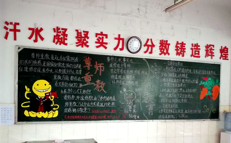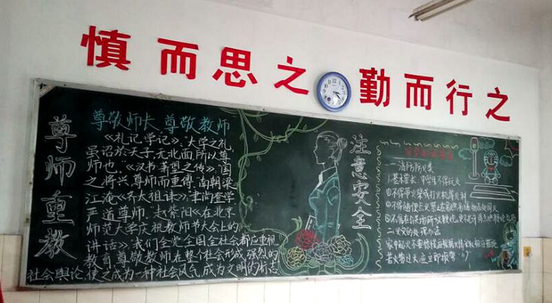 2016年9月,在第32个教师节来临之际,为传承尊师美德,丰富师生教师节活动,并在日常行为规范及环境布置中穿插安全教育知识,防微杜渐,我校开展了以“尊师重教、安全教育”为主题的黑板报评比活动。