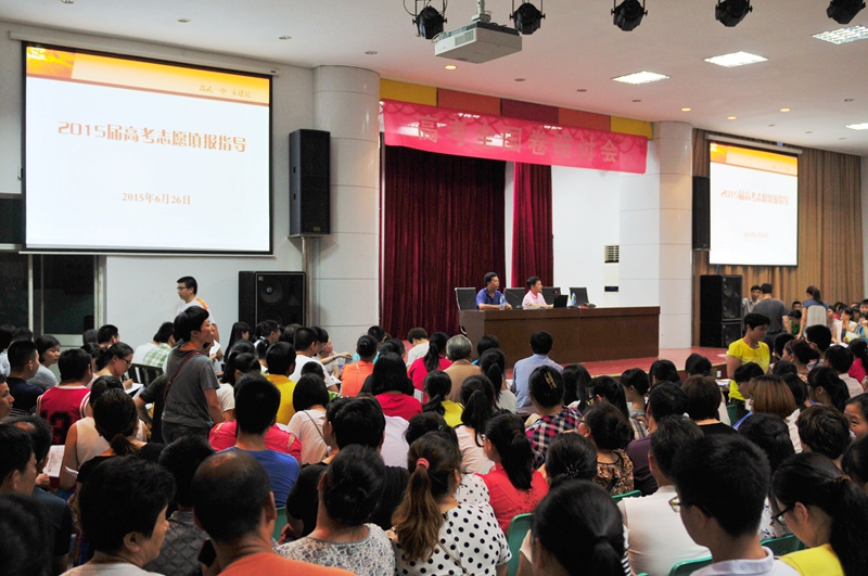 当晚七时,虽然热浪未散,暑气逼人,但参加会议的家长和学生都准时到达,一个只能容纳700多人的报告厅,挤进了1000多人,大家都急切地想知道今年填报志愿的政策和方法。会上,分管高三年段、对高考填报志愿有着多年研究经验的宋建民副校长向取得优秀成绩的考生及其家长表示诚挚的祝贺,对参加会议的全体家长和学生表示热烈的欢迎,并通报了我校今年高考成绩。随后他从五个方面对考生志愿填报工作作了详尽的指导。首先,宋副校长对我省2015年普通高校志愿填报的有关政策进行了解读,并就今年最低分数线的划定、批次安排、各批次的录取方法、考生位次顺序排列、志愿设置、填报流程和投档办法等一系列事项进行了全面而细致的介绍和说明,其中重点讲解了“平行志愿”填报规则以及以志愿优先的传统的“梯度志愿”填报和以分数优先的现今的 “平行志愿”填报的区别,并一一作了举例说明,同时提醒家长和考生要注重填报风险,告诫家长和考生填报志愿如同又一次高考,每一位家长和考生都要高度重视,科学合理有效地填报志愿。对此,宋副校长给出以下建议: