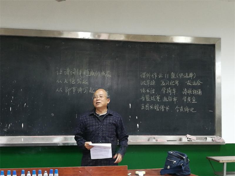 张老师从13岁开始写古典诗歌,对古典诗歌有着浓厚的兴趣和深厚的功底。这堂课,张老师深入浅出地给和平诗社的学生们讲了“即事”事写作的要素:人物、事件、场景。他指出:即事诗,是一种以叙述事情为主要写法的诗词。一事一诗,事即成诗,比较好写。而且有事情为依据,容易做到形象而不空洞。所以初学者可以从这里入手学习。同时,他要求诗社的学生在写作即事诗时要用诗词来歌颂党的领导,歌颂人民的劳动和创造,歌颂祖国的大好河山,歌颂中华传统美德。要以优秀的作品鼓舞人。诗词要有积极向上的精神,不要多愁善感、不要无病呻吟,不要怨天尤人。