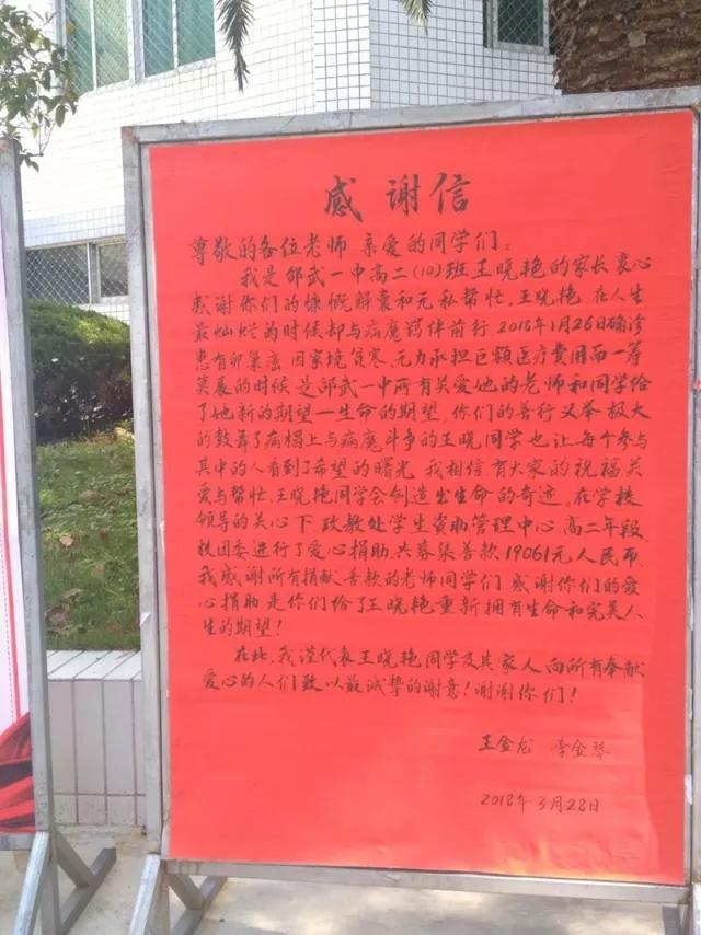邵武一中高二(10)班的王晓艳同学勤奋好学,但不幸突发重病,巨额的医疗费用,给这个家境贫寒的家庭带来巨大的压力和困难,在其一筹莫展之际,我校师生纷纷解囊,捐款相助,在校园里传递着爱的温暖与无私的奉献。在发放仪式上,学生资助管理办公室赵纯锋主任对王晓艳的父亲表示慰问,并送上5000元的校内资助金。高二年段吴雪芬段长、黄小龙书记也将我校高二年段师生的捐助的爱心款14061元递到王晓艳父亲的手中,并送上年段老师和学生的衷心祝福,祝愿晓艳同学早日战胜病魔,回到校园,继续快乐地学习!