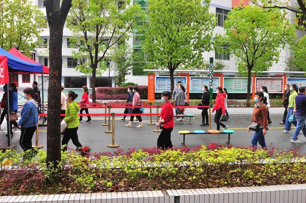 现场井然有序。在行政、安保人员的巡视、维持、疏导下,学生通道前的家长们迅速站成前后间隔1米的四列纵队,时刻提醒,避免人员交谈扎堆;测温点执勤教师能够规范、熟悉使用测温仪器进行高效、精准测量,提高了家长们入校速度,确保了演练的顺利。