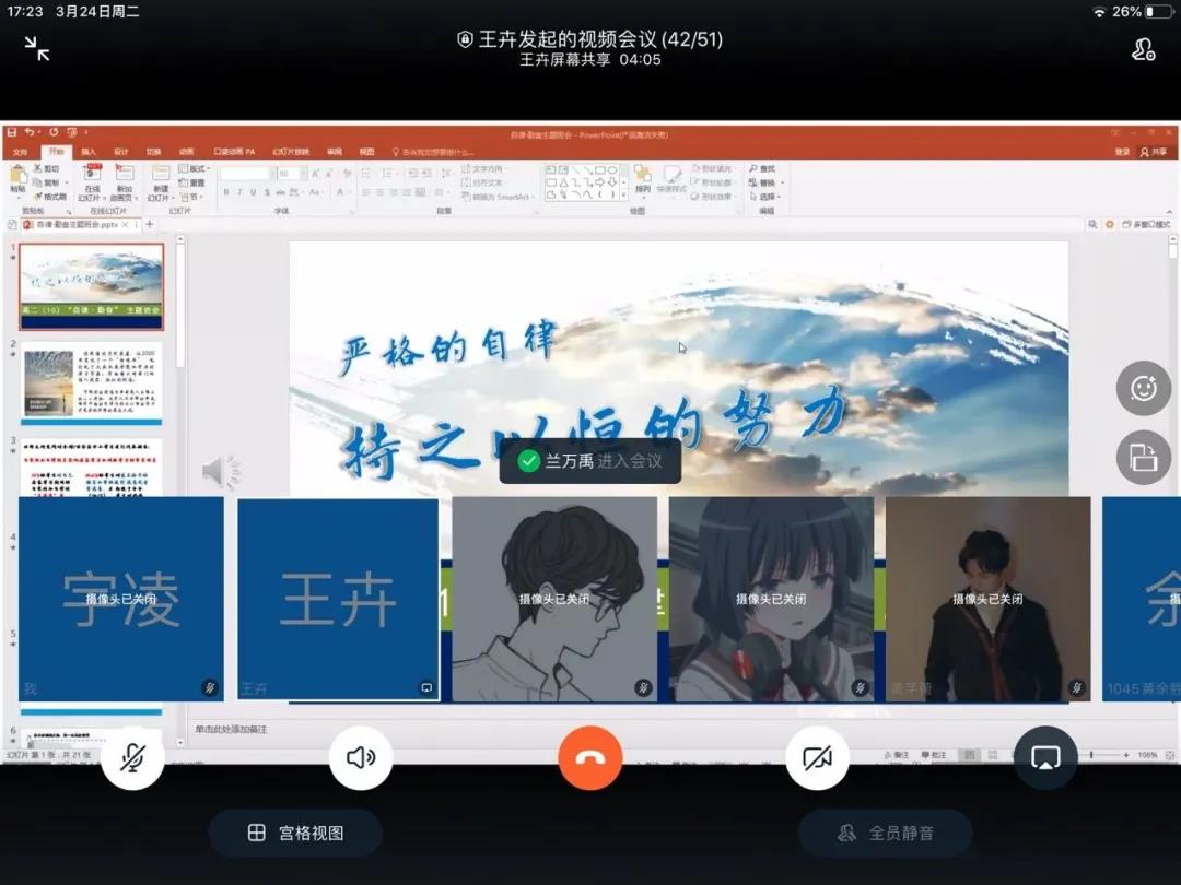在疫情里,有人读出颓废,有人读出自强。本次活动各班借助钉钉平台的视频会议或在线直播功能,全班再一次凝聚在一起,共同讨论疫情下的学习现状,各班班主任对开学以来班级的学习情况做了一个总结,明确下阶段要求,并期望学生们都能够朝着“自律”的方向努力。