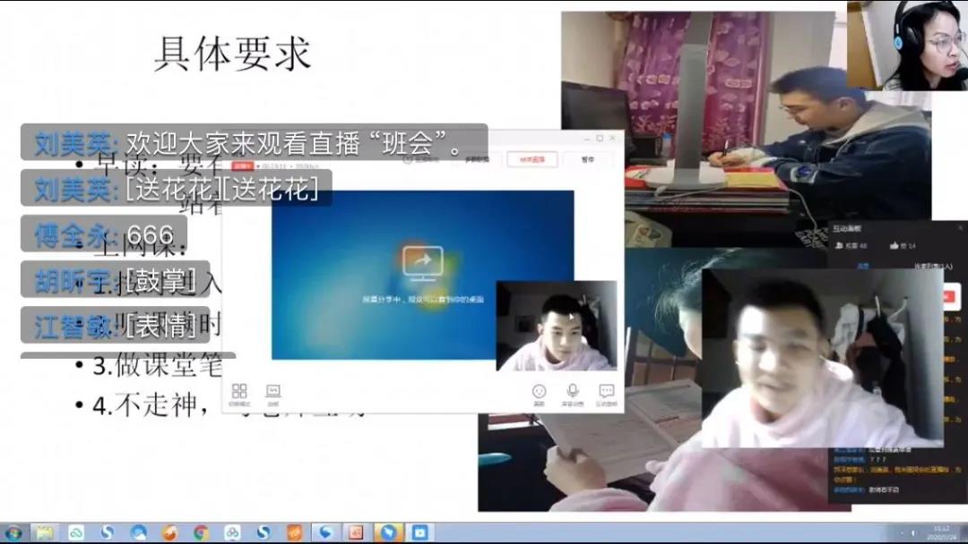主题班会中,有的班级讨论了国家的强大、团结,从而激发了学生线上学习的学习动力;有的班级分享学习照片,由同学们总结高效学习的方法;有的班级在讨论“成为一个怎样的人”时,明确了一个时代有一个时代的精神,一代人担负一代人的责任;有的班级以班上同学自律专注的APP展示内容为例,树立班级榜样,强化学生目标管理,用自律和勤奋坚持来实现自己的人生价值,有的班级……