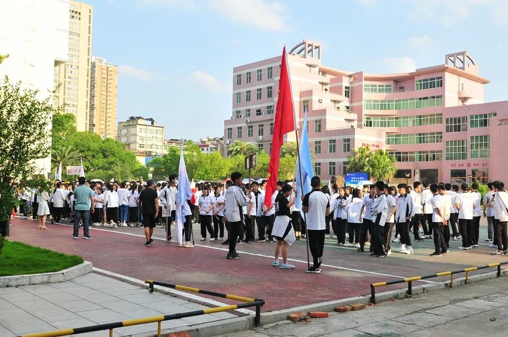 同学们集合完毕后出发,绵延数百米的行进队伍,洋溢着青春的朝气和活力,学生们手擎校旗与各班班旗,喊着口号,有序前行。