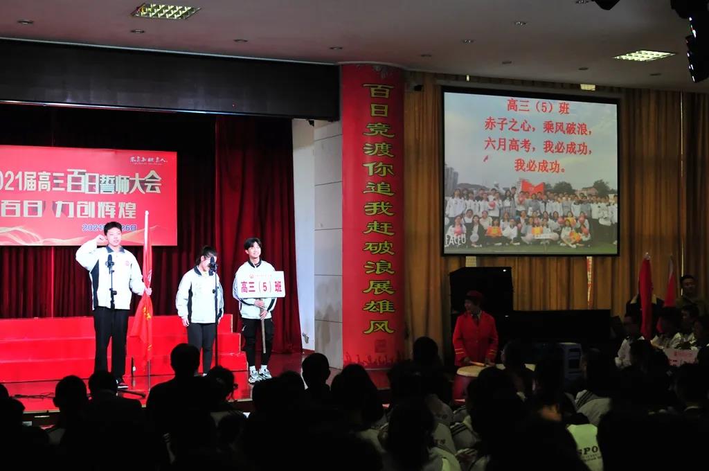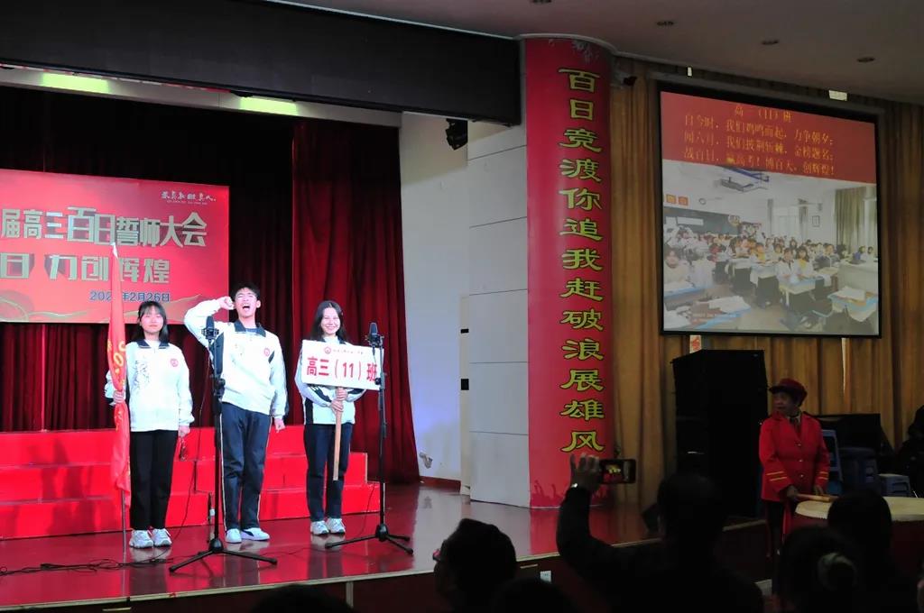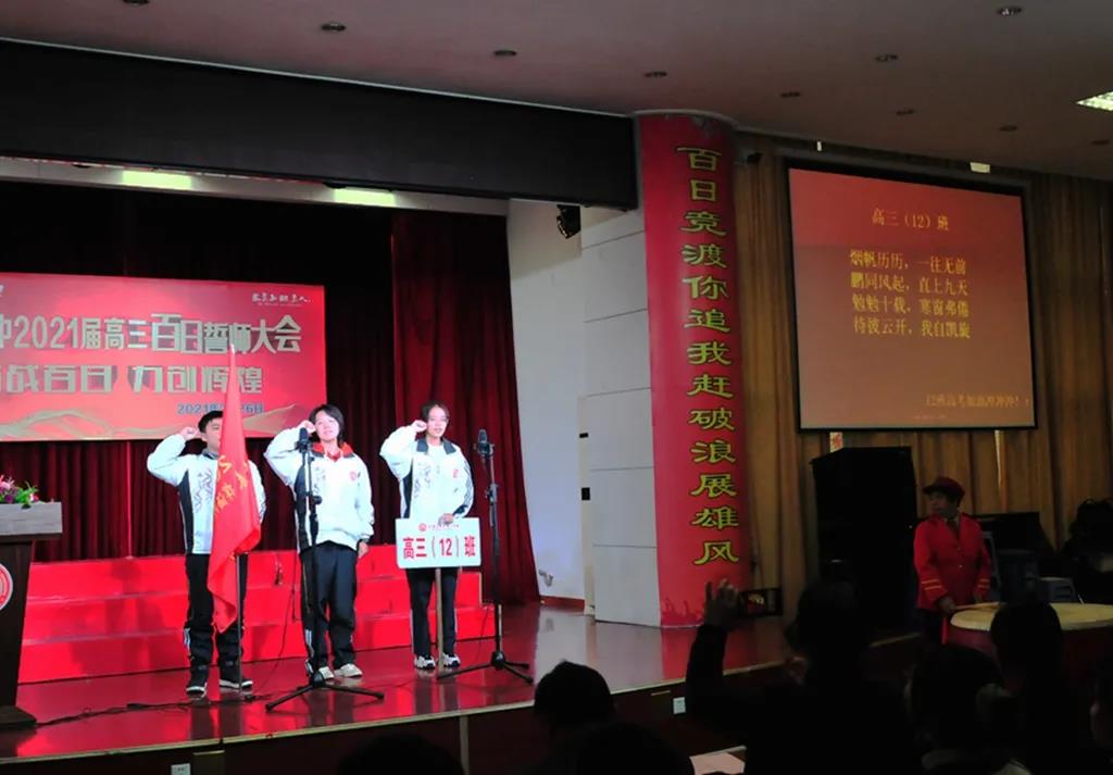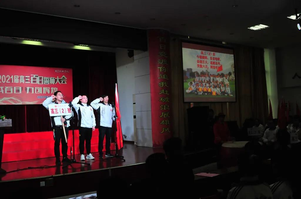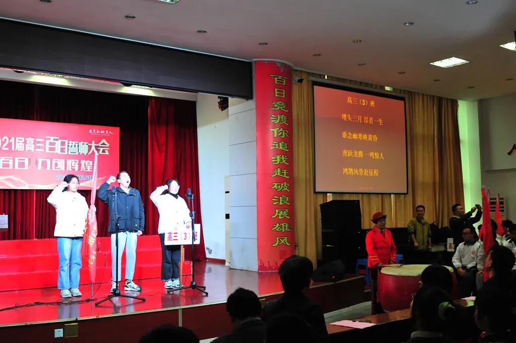 “精讲巧练、把握方向;甘做人梯、培育栋梁”“慢做会,求全对。稳做中档题,一分不浪费。冲刺985,决战211”“全力以赴,背水一战。攻坚必克,百炼成钢”“鹰隼试翼,永不言弃。风尘翕张,直面阳光”“战百日,赢高考!博百天,创辉煌!”……岂曰无衣,与子同袍。在气势磅礴的阵阵鼓声里,高三年段全体老师和14个班级依次进行铿锵有力的宣誓,点燃了全场高三学子冲刺百日,拼博奋斗的热血与豪情。
