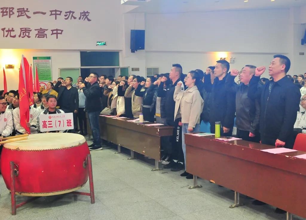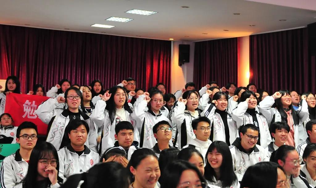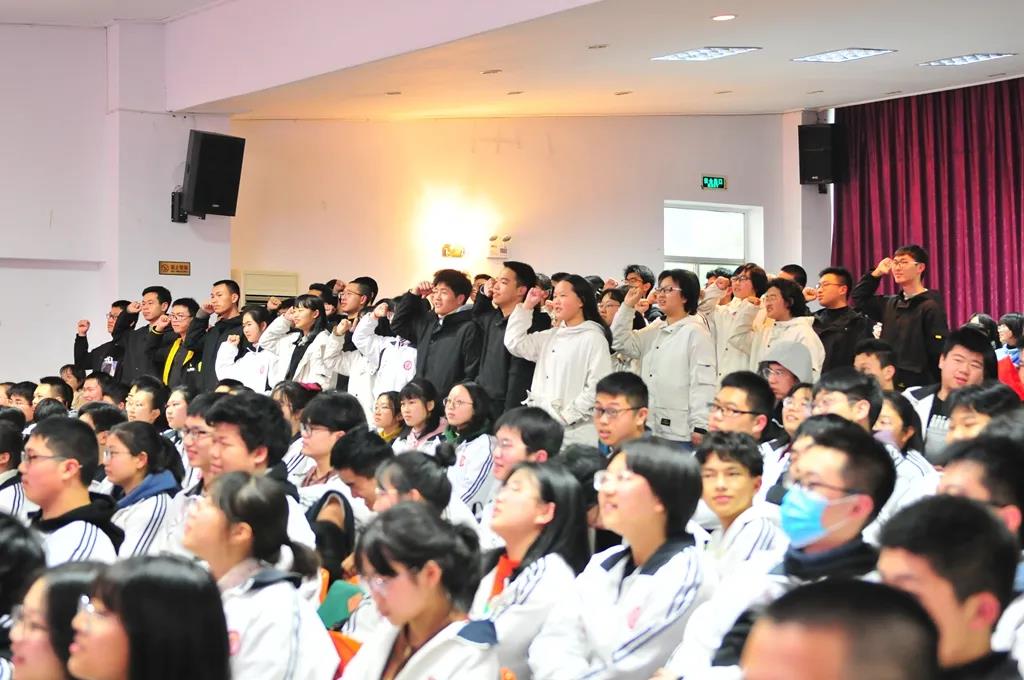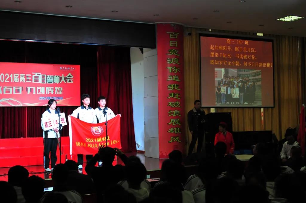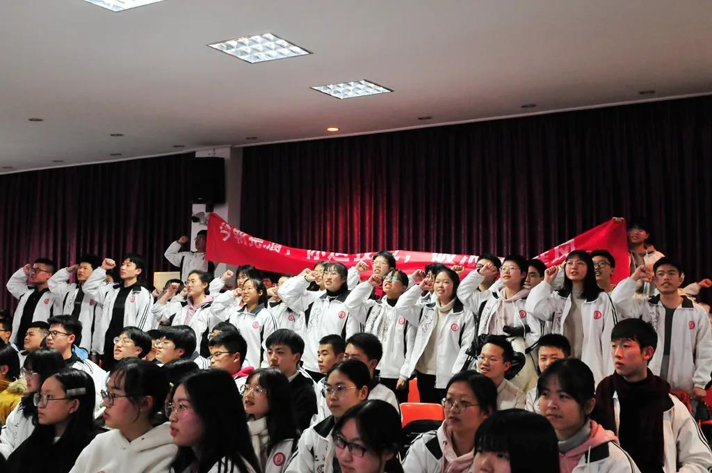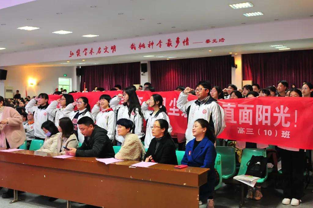 “精讲巧练、把握方向;甘做人梯、培育栋梁”“慢做会,求全对。稳做中档题,一分不浪费。冲刺985,决战211”“全力以赴,背水一战。攻坚必克,百炼成钢”“鹰隼试翼,永不言弃。风尘翕张,直面阳光”“战百日,赢高考!博百天,创辉煌!”……岂曰无衣,与子同袍。在气势磅礴的阵阵鼓声里,高三年段全体老师和14个班级依次进行铿锵有力的宣誓,点燃了全场高三学子冲刺百日,拼博奋斗的热血与豪情。