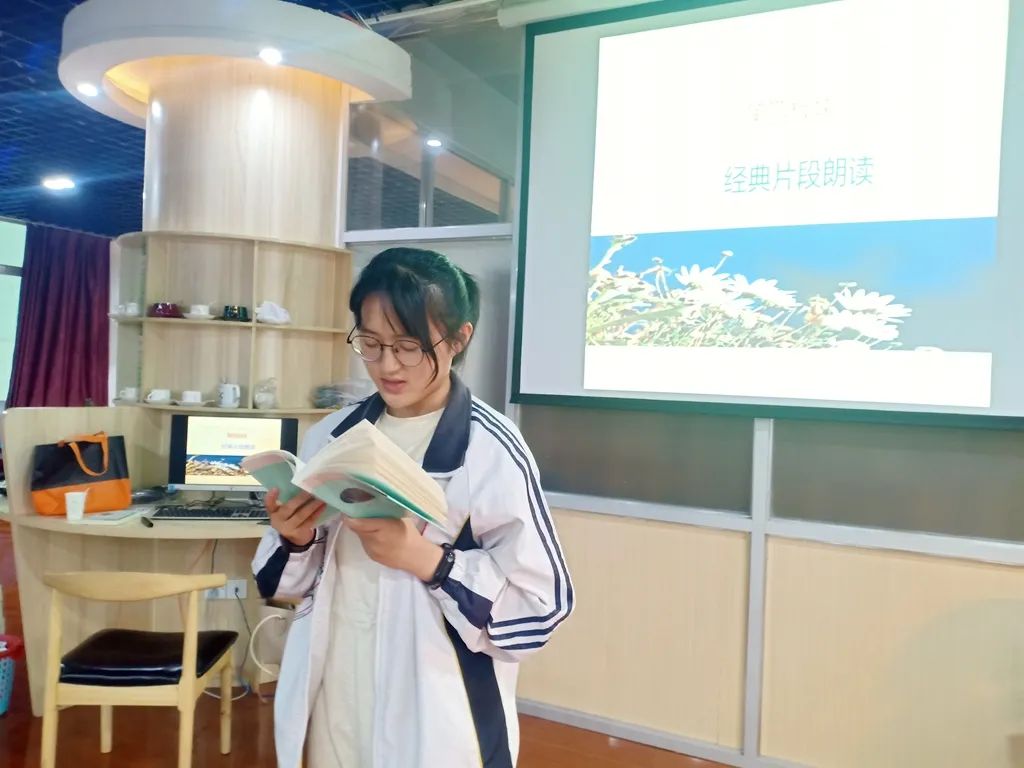 参与分享是读书活动举办的意义所在。在经典片段朗读环节,有五位同学积极上台阅读了他们喜欢的书中片段,他们声情并茂的朗读赢得了同学们的喝彩。