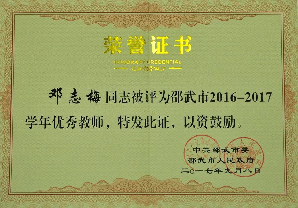 邓志梅老师教学能力突出,成绩优异。担任班主任期间,其所带班级多次获“邵武市先进班集体”称号。她坚持宽严并济,尤其重视学生行为习惯的养成,对学生严格要求又关爱有加。“感人心者,莫先乎情。”她曾与一深陷网络游戏的学生进行持续一个多月的谈心谈话,最终帮助其克服网瘾、重拾斗志,取得当年邵武一中文科状元的优异成绩。邓老师不仅注重知识的传授,而且关注学生身心发展,特别擅长与学生进行思想交流。她希望自己永远保持阳光乐观,为学生在风雨中撑起一把伞,在迷茫中照亮一段路。她与每一届学生都构建起良好的师生关系,被学生亲切地唤作“梅姐”。