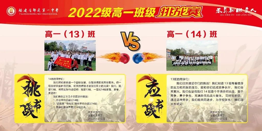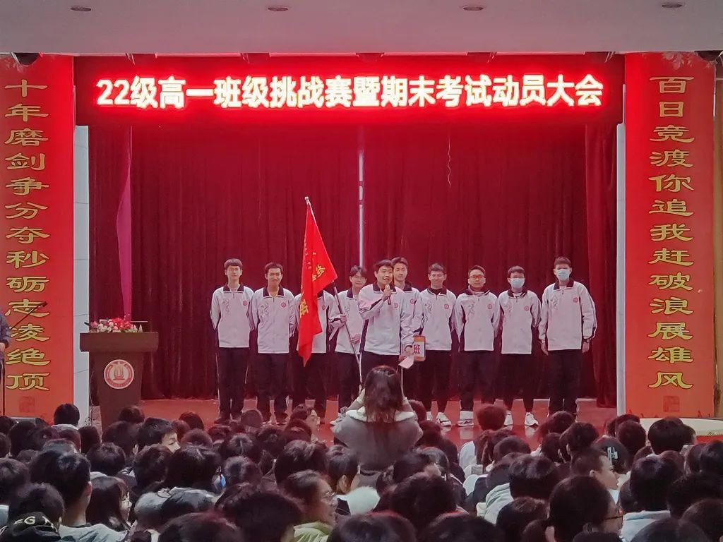首先由温暖宁段长宣读班级挑战的规则和意义,随后高一3班、10班、13班依次发起挑战,高一4班、6班、14班积极应战。参加挑战赛的班级纷纷派代表上台,高举班牌和班旗,斗志昂扬地宣读了自己的挑战书和应战书。台上班级代表字字铿锵,台下学子豪气干云,他们用坚定的声音传递挑战的决心与迎战的勇气。交换的战书是奋战的誓言,更是如火青春的深刻印记。以比赛促进学习,以竞争提升成绩。此外,6个班的班主任们也上台为自己的班级鼓舞士气,加油助威。在一阵阵热血沸腾的呐喊中,现场气氛推向高潮,同学们脸上的坚毅与勇敢,彰显了勇者无畏的决心!