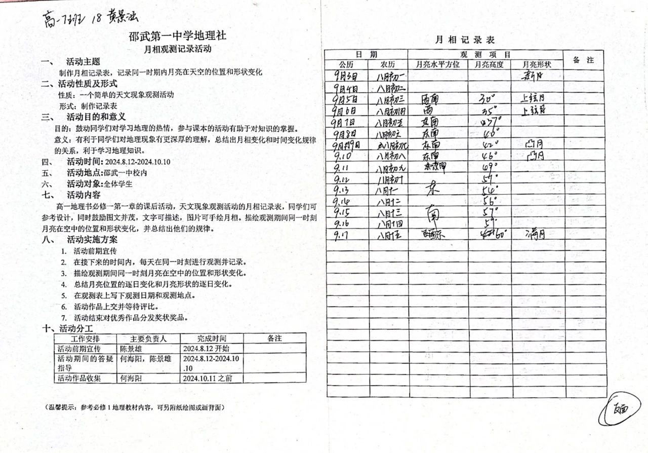 为贯彻落实新课标要求,提升学生地理实践力核心素养,邵武一中地理社于8月-12月期间举办校内月相观测活动,此次活动面向全体学生,以拍摄或者绘画的形式提交一份作品。