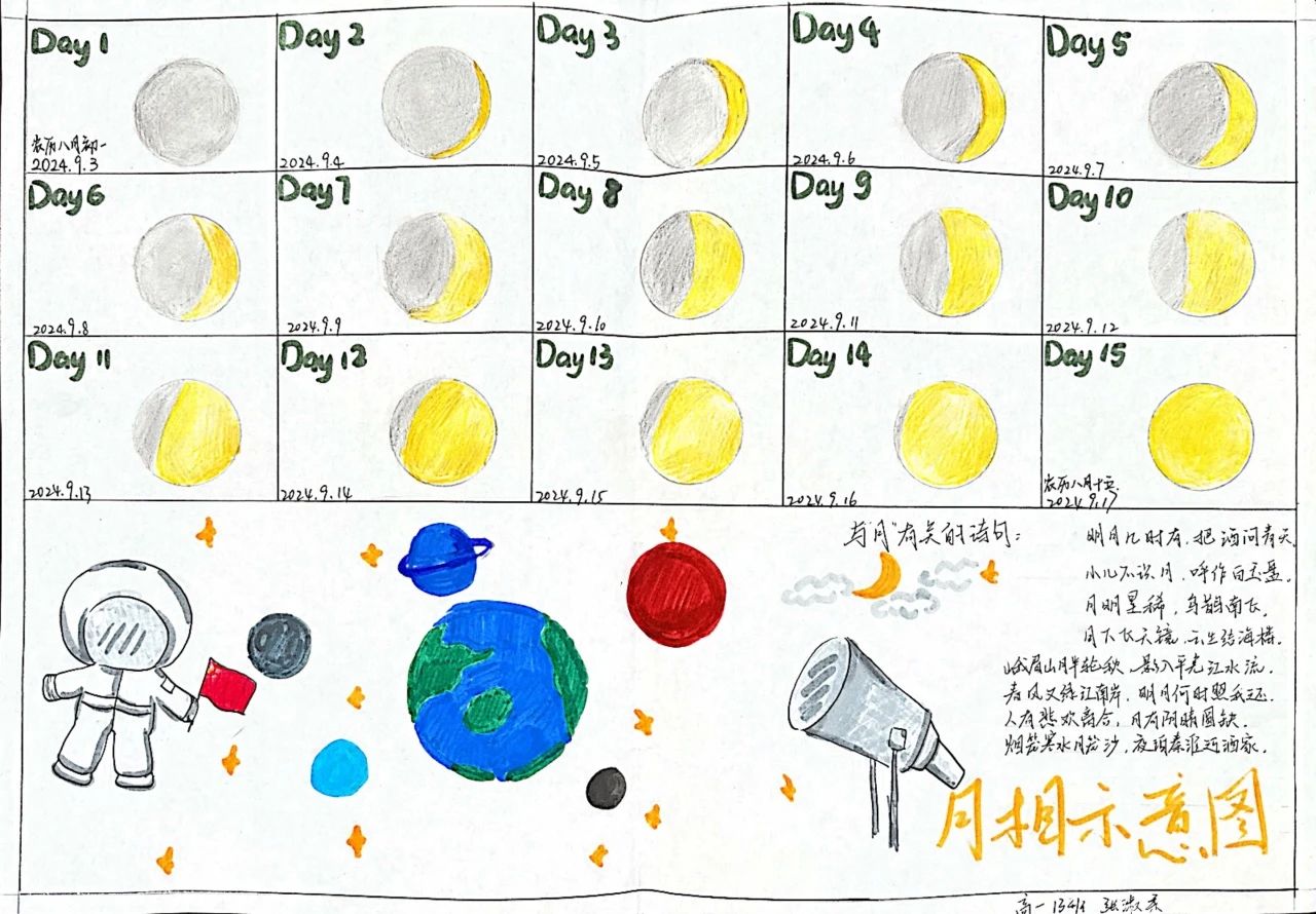 活动得到学生们的踊跃参与,地理社收到了丰富多彩的学生作品,每一张图片和记录表都各有千秋,通过此次月相观测活动,激发了学生对天文的兴趣,培养观察能力和科学探索精神,这次活动不仅是一项观测活动,更是一次科学探索的旅程。活动截止后,地理社邀请我校地理组教师组织作品评审,并对优秀作品进行表彰和颁发奖励。