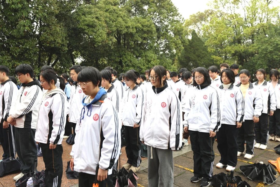 默哀时,陵园一片寂静,全体师生们低头肃立,向革命先烈致以最深切的缅怀。
