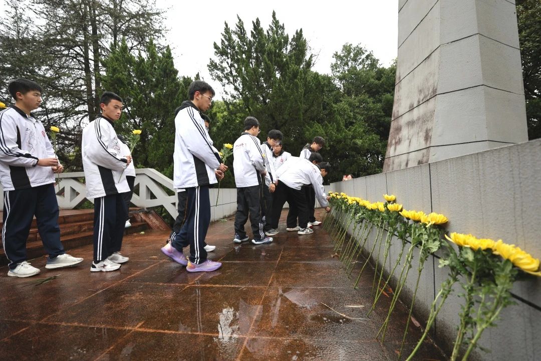 在献花环节,全体师生手捧鲜花,缓步走向革命烈士纪念碑,敬献鲜花并瞻仰,寄托对先烈的无限追思。