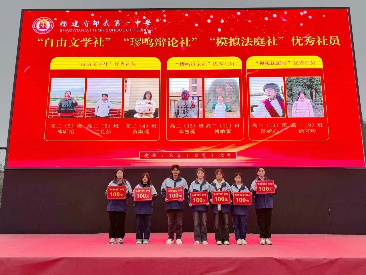 作为鼓励学子博览群书、深耕文史的重要平台,第四届“读书暨文史奖”覆盖六大社团。“求真读书社”吴欣怡、范紫桐、严何静秋、张悦宁等,“和平诗社”吴康萍、赵晶慈、肖欣怡;“《青春号角》编辑社”何楷卓、吴文博、童旭泽、黄子涵、汪昊文;“自由文学社”傅昕怡、兰礼彭、黄淑瑶;“璆鸣辩论社”李恕蕊、傅敏蕾;“模拟法庭社”陈婉心、徐秀珍等数十名优秀社员脱颖而出,校领导分别为他们颁奖,学生综合素质的提升未来可期。