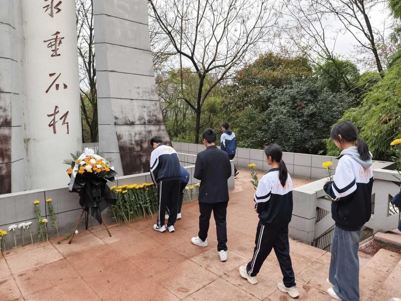 仪式尾声,全体师生在纪念碑前合影留念。一张张青春的脸庞坚定而庄重,那是信仰的传承,也是未来的希望。随后,队伍有序离场。来时脚步沉重,归时心中明亮——这不仅是一次祭扫,更是一堂行走的思政课,一次心灵的洗礼。
