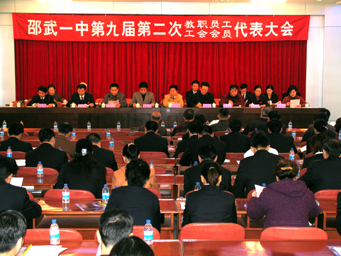 11月20日,邵武一中在校教工会议室召开第九届第二次教工代表大会。邵武市总工会主席陈九生,市教育局党委书记吴建华出席了大会并发表谈话。本次教代会的主要议程有:范纯善校长作《学校工作报告》,张光华书记作《五年规划报告》,林普光主席作《工会工作报告》,吴凯民主任作《岗位补贴实施办法》专题议案报告,饶干东主任作《财务管理工作报告》,郭文玉副主席作《关于上次教代会提案落实及本次提案征集的处理情况报告》,提案解答、民主评议校领导干部、分组讨论报告和议案、主席团会议、议案表决等。