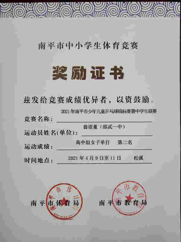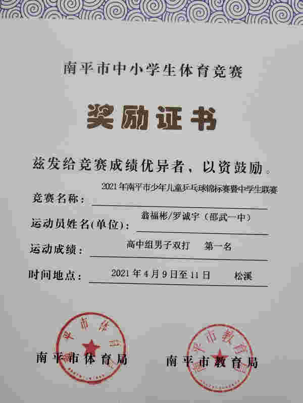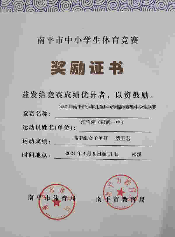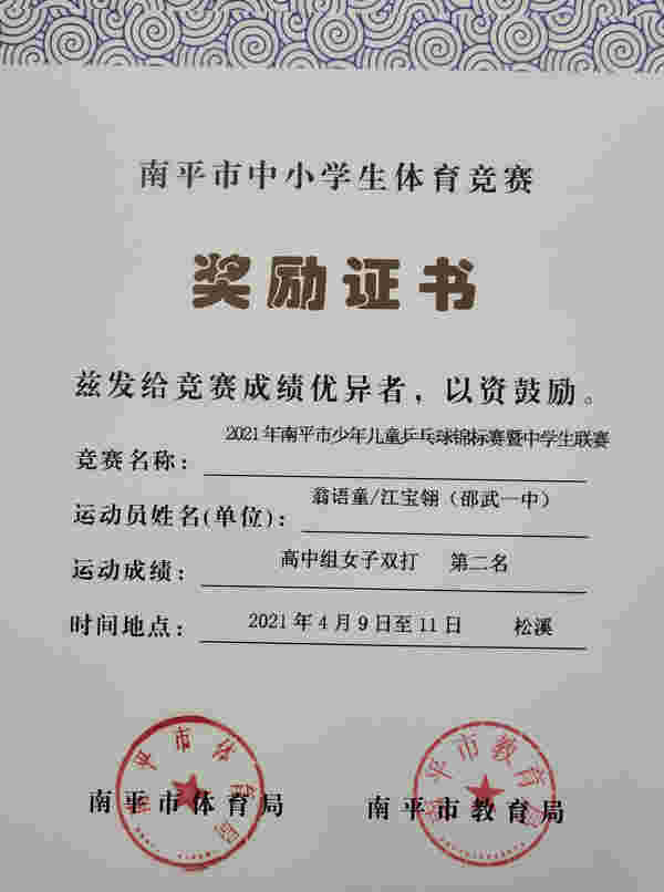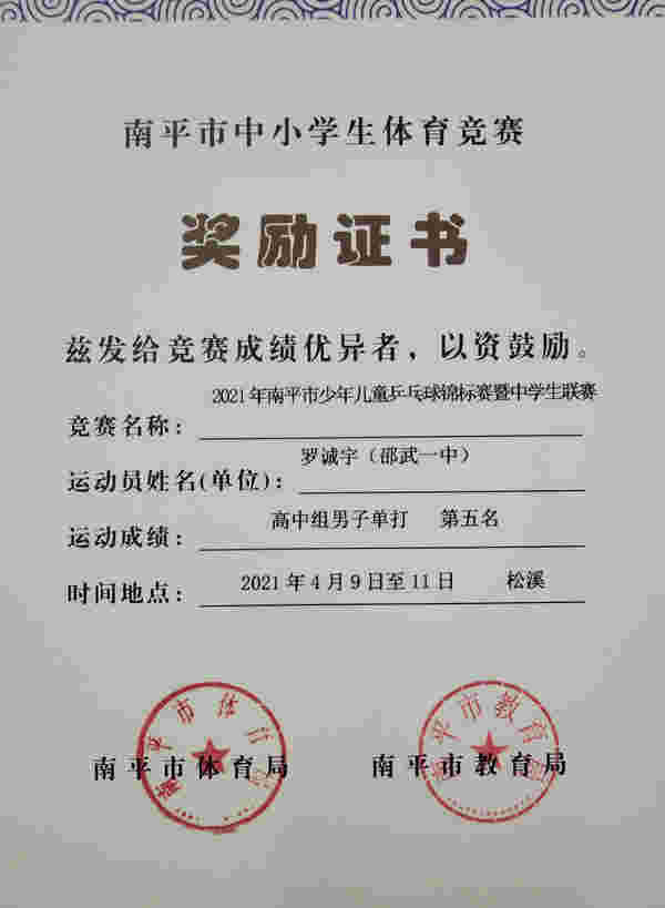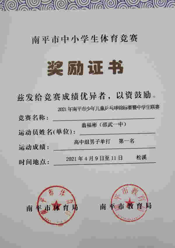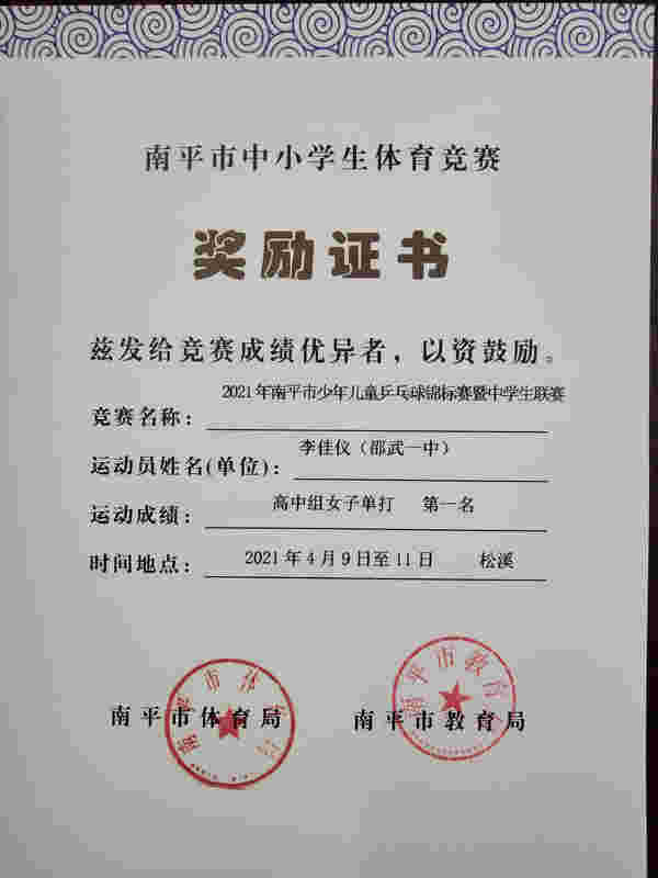 2021年南平市少年儿童乒乓球锦标赛暨中学生联赛于4月9日到11日举行,我校参赛选手有高二年段翁福彬,翁语童;高一年段李佳仪,罗诚宇,江宝翎,叶蕴希。在李德老师的指导下和赛场的良好发挥,为学校获得团体总分一等奖的好成绩。翁福彬同学获得男子单打第一名,李佳仪同学获得女子单打第一名,翁语童同学获得女子单打第二名,翁福彬同学和罗诚宇同学获得男子双打第一名,翁语童和江宝翎同学获得女子双打第二名。