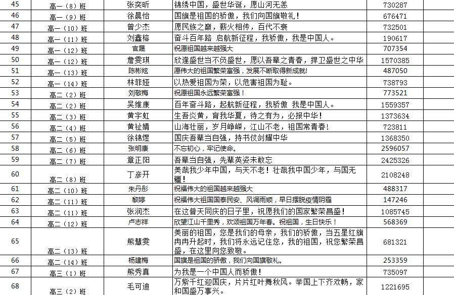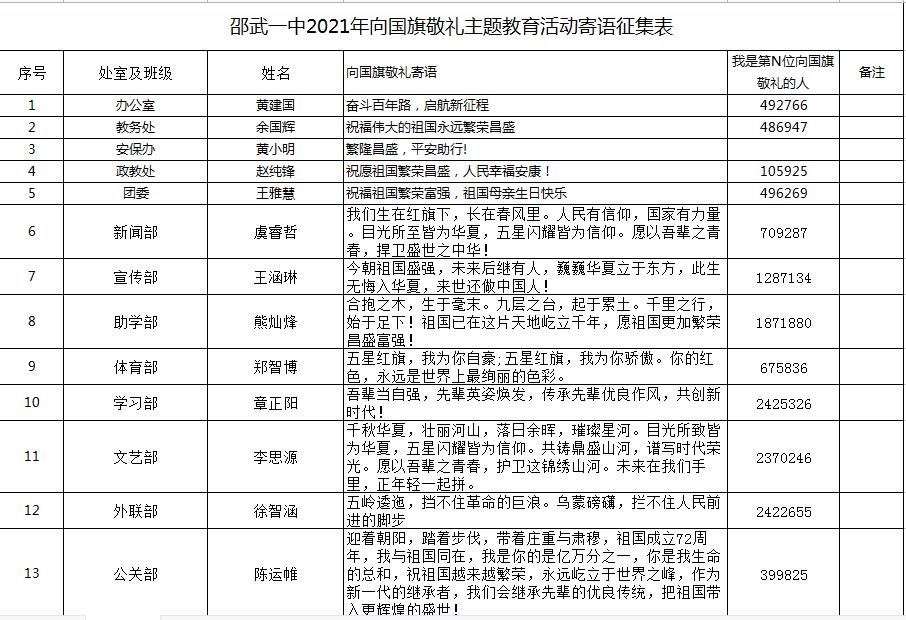 邵武一中各处室主任、团委书记、年段支部书记、班级团支部书记、学生会及社联部长们代表自己所在的部门通过扫描二维码方式参与向国旗敬礼活动并写下对祖国的美好祝福(寄语)。