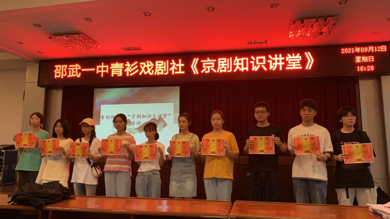 2021年9月12日14时30分至16时30分,邵武一中青衫戏剧社在教职工会议室举行"京剧知识讲堂"活动,本次活动为了弘扬中华国粹,发展中国传统艺术,传承中国古典文化,把我校“京剧进校园”活动引向深入。