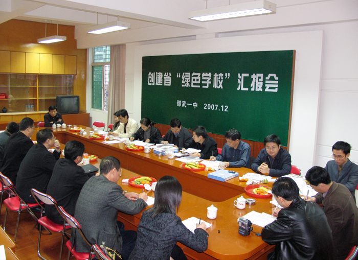 2007年12月11日下午,省环保局、教育厅创建“绿色学校”考评组领导、专家一行9人在省环保局宣教中心教育科科长黄妙云的带领下到我校考评创建工作。考评组听取了政教处主任杨方作的《创建绿色学校 建设和谐校园》的学校环境教育工作汇报,查阅了有关资料,到校园、食堂、实验室等实地查看,召开了教师和学生座谈会。