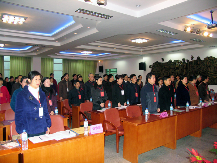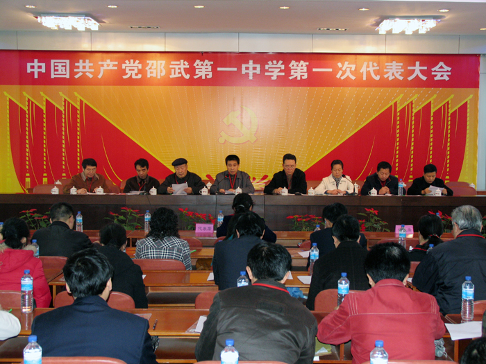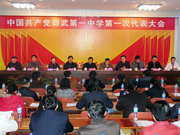 中国共产党邵武第一中学第一次代表大会于12月23日上午在校教工会议室隆重开幕。大会主席台前,花团锦簇,大会标语醒目地悬挂在主会场上方,主席台中央,十面鲜艳的红旗簇拥着党徽,在鲜花绿植的映衬下,显得庄重而热烈。