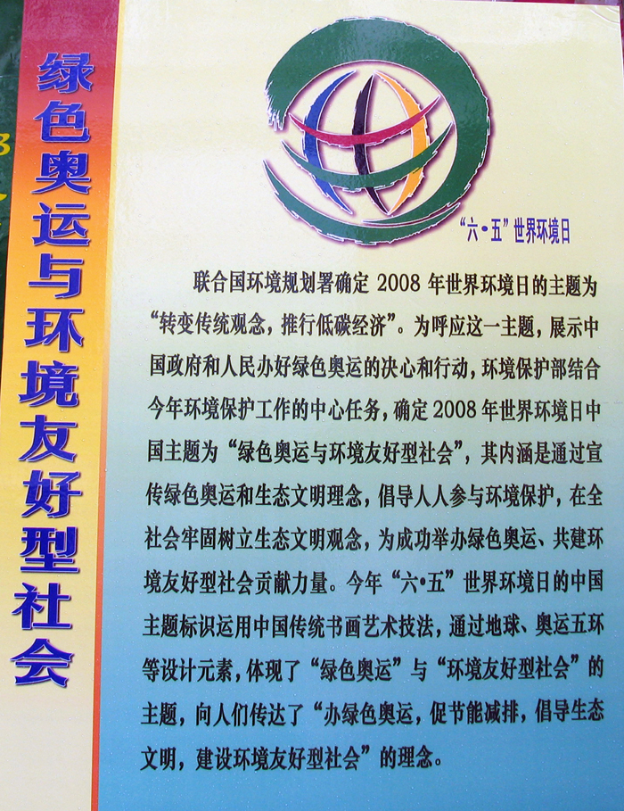 据了解,2008年世界环境日主题被联合国环境规划署确定为“转变传统观念,推行低碳经济”。为呼应这一主题,展示中国政府和人民办好绿色奥运的决心和行动,中国环境保护部结合今年环境保护工作的中心任务,确定2008年世界环境日中国主题为“绿色奥运与环境友好型社会”。