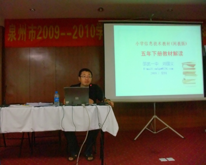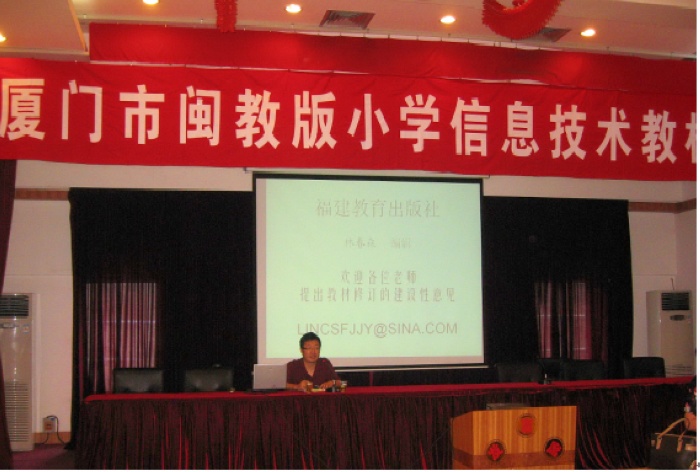 应福建教育出版社邀请,一中信息技术教师刘国文利用暑假里的四天时间,为泉州、漳州市两市的一线信息技术教师进行培训。培训由两市教育局主办,培训其间,作为《福建省小学信息技术》教材副主编的刘国文老师为两市的信息技术教师们解读了《福建省小学信息技术》的编写意图并提出了自己的教学建议。在去年至今年期间,刘国文教师还先后四次为南平、厦门等市的信息技术教师解读本套教材。