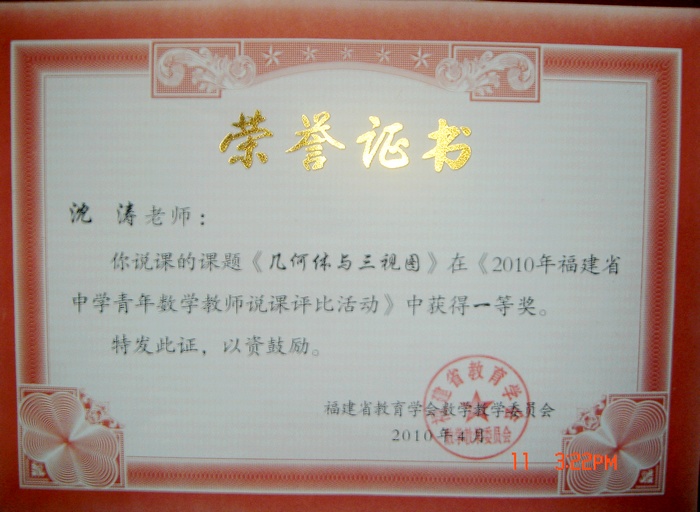 我校青年数学教师在2010年福建省说课比赛中获一等奖