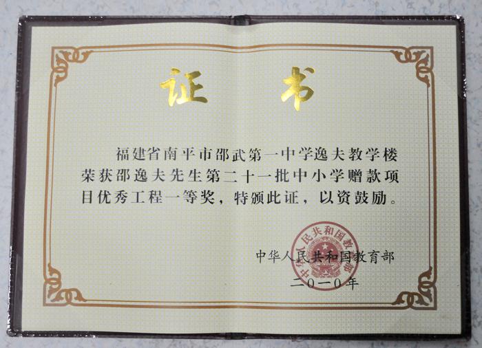 日前,邵武一中逸夫教学楼工程项目经过省级专家评选推荐,荣获国家教育部颁发的“邵逸夫先生第二十一批中小学赠款项目”优秀工程一等奖。