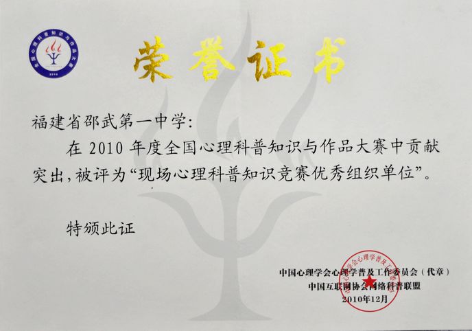 校园新闻 我校荣获现场心理科普知识竞赛优秀组织单位 作者:admin 来源:本站原创 日期:2011-03-04 人气:2546 上一篇:邵武一中代表队荣获市第九套大众广播体操比赛二等奖 下一篇:邵武一中团委学生会阳光体育三对三篮球赛火爆开赛 通知公告 更多 【瑞榴 • 公告】2026年邵武一中第... 【瑞榴 • 公告】2026年邵武一中自... 【瑞榴 • 公告】2026年福建省邵武... 【瑞榴 • 公告】2026年福建省邵武... 【瑞榴 • 公告】2025年邵武一中第... 【瑞榴 • 公告】2025年福建省邵武... 最新动态 更多 【瑞榴 • 安全】防毒护苗,青春无... 【瑞榴 • 教研】研讨聚智谋备考 ... 【瑞榴 • 工会】规范器材使用 护... 【瑞榴 • 社团活动】品《人生》悟... 【瑞榴 • 教研 】迎视导精研备考... 【瑞榴 • 党委工会】巾帼心向党 ... 【瑞榴 • 安全】瑞榴启新程 安全... 【瑞榴 • 安全】居安思危强技能 ... 【瑞榴 • 年段活动】星驰万里,共... 【瑞榴 • 年段活动】瑞榴长青 砥...