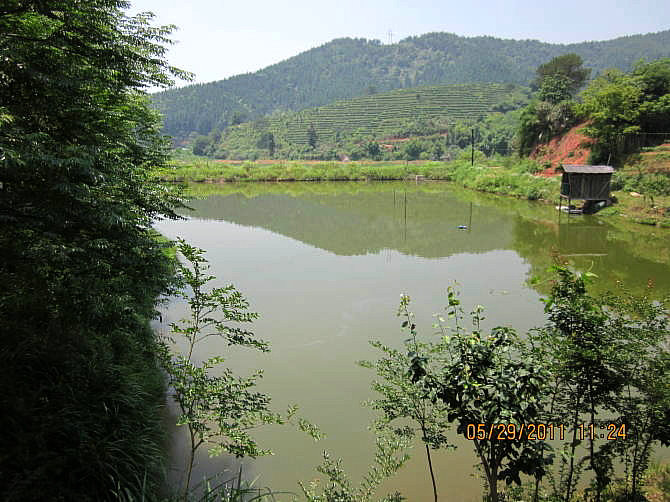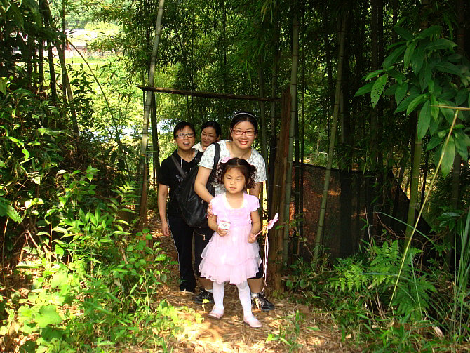 车一出城就可感觉到郊外湿润清新的空气,也就十几分钟的车程,我们就到达了。山庄是农家乐山庄,环境幽雅清静,充满野趣:长长的竹木走廊,隔开了左右两边各一个大大的池塘,鲤鱼嬉戏,白鲢欢跳;四周青山环抱,清新的空气沁人心脾。居然还有好多比我们更早到达的团队呢,他们坐在这绿荫环绕的庭院内品茗香茶、打牌、看书、聊天,个个都甚是惬意。