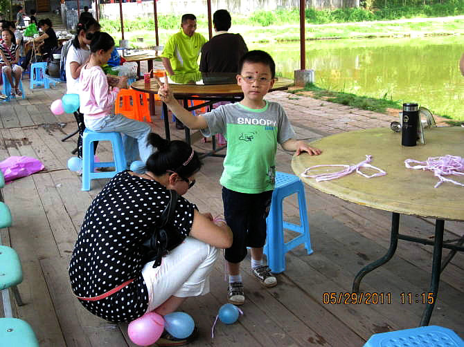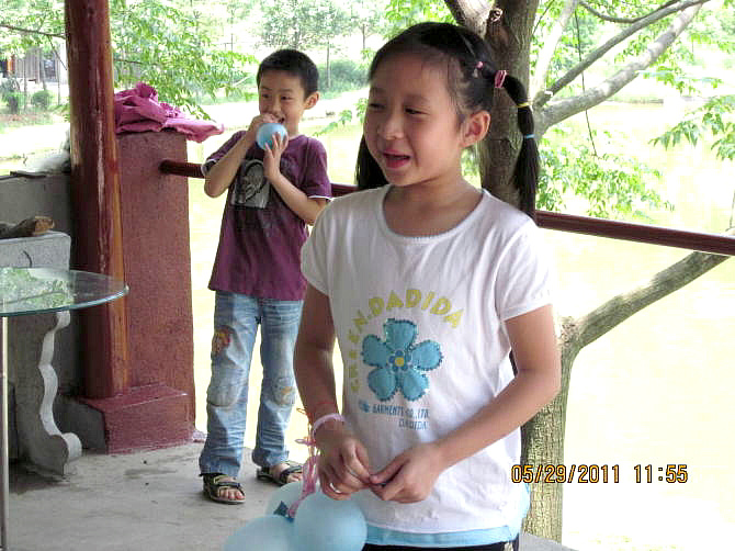 准备踩气球活动喽!我再将气球绑高些!