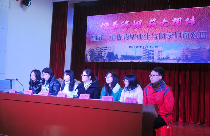 16日下午,来自北京大学、中央财经大学、武汉大学、北京语言大学、中国传媒大学、北京交通大学的一中2011届7名优秀毕业生相约来到母校一中,开展“情系瑞榴,薪火相传” 2012年优秀大学生面对面活动。学校高三年段700多名师生参加了活动,活动中,大学生们就大学生活的丰富多彩、工作与学习的关系等问题与高三同学们进行了交流。在场的同学们普遍认为学长们的观点贴近实际,对他们有很大的启发作用。活动结束后,学弟学妹们抢着要学兄学姐们签名勉励留言,久久不愿离去!