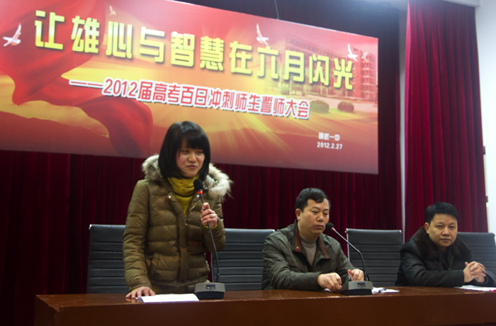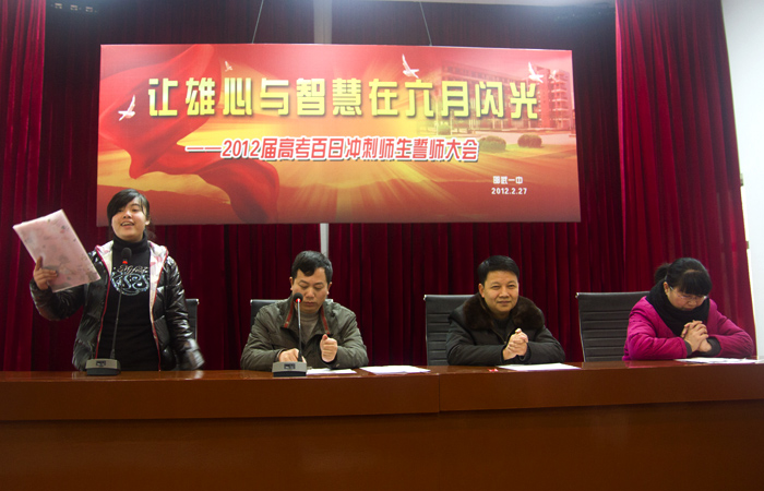 当日,首先由分管领导宋建民副校长作了热情洋溢的讲话,激励即将走向高考的学子发扬敢拼敢赢的精神,严格要求自己,按照年段总体要求和计划,讲求复习质量,提高复习效率,争分夺秒,稳扎稳打,不负众望,务求全胜。接着十五个班级的学生代表纷纷上台发言,激情飞扬,句句话语催人奋进;而后由两位老师分别代表班主任和科任老师发言,表达了高三全体教师对学生的殷切希望,同时给莘莘学子提出百日冲刺的学习方法和生活提示。最后,全体师生齐读《2012届高三百天誓师大会誓词》。整个会场互动热烈,学生热情高涨,展现了邵武一中高三学子饱满的精神状态和对高考必胜的信心。