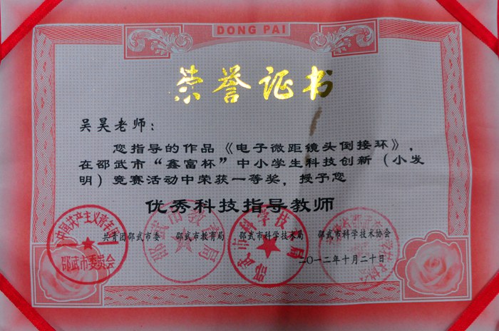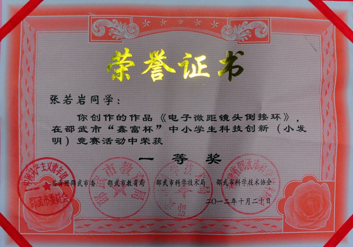 在刚刚结束的邵武市首届中小学科技创新大赛上,一中张若岩同学在指导教师吴昊指导下报送的作品“电子微距镜头倒接环”在大赛中荣获一等奖。