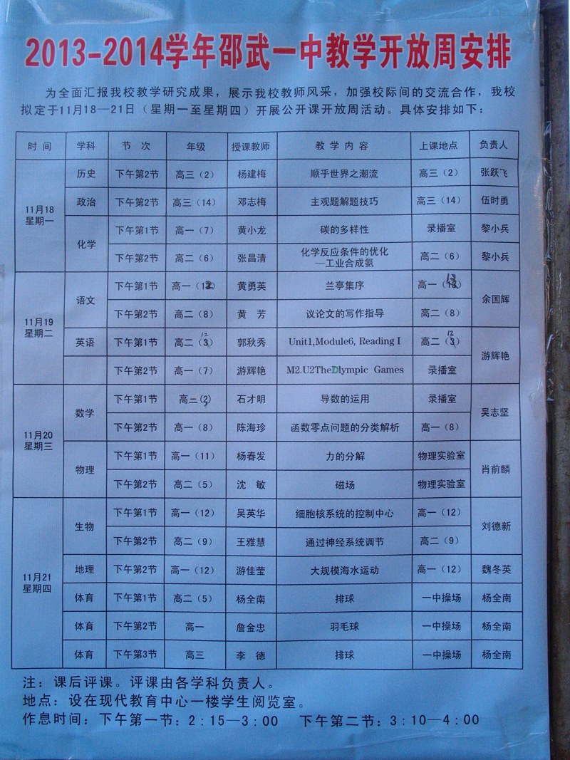 校园新闻 邵武一中开展2013-2014学年教学开放周活动 作者:admin 来源:本站原创 日期:2013-11-20 人气:2403 11月18日至21日,邵武一中面向全市高中学校开展教学开放周活动,10个学科18位中青年教师一展教学风采。活动中,各学科教研组精选授课教师,力求结合新课改,做到示范性、新颖性。参与听课及评课的教学同仁都对本次活动作出了很高的评价。这次教学开放周活动达到了促进教师的专业成长,搭建兄弟学校之间交流平台的目的。 上一篇:一中图书馆顺利通过“省级中小学示范图书馆”复查 下一篇:我校举办节日、安全、法制小报展 通知公告 更多 【瑞榴 • 公告】2026年邵武一中第... 【瑞榴 • 公告】2026年邵武一中自... 【瑞榴 • 公告】2026年福建省邵武... 【瑞榴 • 公告】2026年福建省邵武... 【瑞榴 • 公告】2025年邵武一中第... 【瑞榴 • 公告】2025年福建省邵武... 最新动态 更多 【瑞榴 • 安全】防毒护苗,青春无... 【瑞榴 • 教研】研讨聚智谋备考 ... 【瑞榴 • 工会】规范器材使用 护... 【瑞榴 • 社团活动】品《人生》悟... 【瑞榴 • 教研 】迎视导精研备考... 【瑞榴 • 党委工会】巾帼心向党 ... 【瑞榴 • 安全】瑞榴启新程 安全... 【瑞榴 • 安全】居安思危强技能 ... 【瑞榴 • 年段活动】星驰万里,共... 【瑞榴 • 年段活动】瑞榴长青 砥...