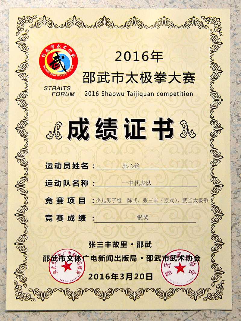 校园新闻 一中健儿在邵武市太极拳大赛取得佳绩 作者:佚名 来源:本站原创 日期:2016-03-23 人气:2398 3月19日-20日,由市文体广新局主办,市武术协会承办的2016年邵武市太极拳大赛在体育馆举行。这是邵武市被评为“全国武术之乡”后举办的第一次太极拳单项赛事,全市共有29支队伍近三百人参赛。由一中选送的郭心铭同学荣获得少儿男子组银奖,毛文武老师荣获老年、成年男子组铜奖。 上一篇:保护森林,人人当尽责 下一篇:邵武一中多渠道开展春季防火宣传工作 通知公告 更多 【瑞榴 • 公告】2026年邵武一中第... 【瑞榴 • 公告】2026年邵武一中自... 【瑞榴 • 公告】2026年福建省邵武... 【瑞榴 • 公告】2026年福建省邵武... 【瑞榴 • 公告】2025年邵武一中第... 【瑞榴 • 公告】2025年福建省邵武... 最新动态 更多 【瑞榴 • 安全】防毒护苗,青春无... 【瑞榴 • 教研】研讨聚智谋备考 ... 【瑞榴 • 工会】规范器材使用 护... 【瑞榴 • 社团活动】品《人生》悟... 【瑞榴 • 教研 】迎视导精研备考... 【瑞榴 • 党委工会】巾帼心向党 ... 【瑞榴 • 安全】瑞榴启新程 安全... 【瑞榴 • 安全】居安思危强技能 ... 【瑞榴 • 年段活动】星驰万里,共... 【瑞榴 • 年段活动】瑞榴长青 砥...