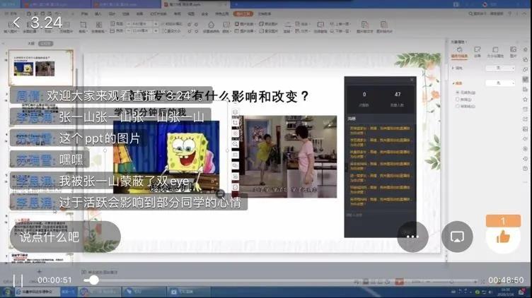 主题班会中,有的班级讨论了国家的强大、团结,从而激发了学生线上学习的学习动力;有的班级分享学习照片,由同学们总结高效学习的方法;有的班级在讨论“成为一个怎样的人”时,明确了一个时代有一个时代的精神,一代人担负一代人的责任;有的班级以班上同学自律专注的APP展示内容为例,树立班级榜样,强化学生目标管理,用自律和勤奋坚持来实现自己的人生价值,有的班级……